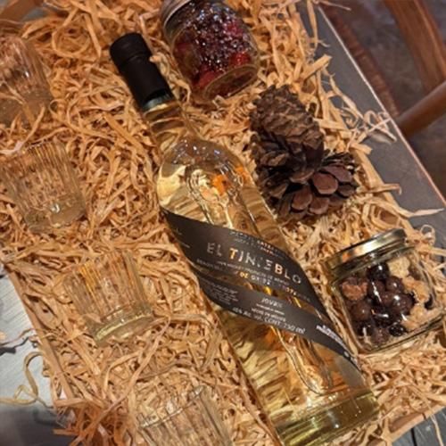 Una elección sencilla y encantadora Mezcal El Tinieblo Joven Ensamble (40°). 4 vasos mezcaleros. 3 frascos de botanas artesanales.